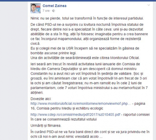 Cornel Zainea susține că după ce a consultat în Monitorul Oficial activitatea Comisiei de Mediu pe luna ianuarie din Camera Deputaților a sesizat că Ministrul Mediului, Daniel Constantin nu a avut niciun vot împotriva unui aviz favorabil, deși în realitate au fost 7 voturi împotriva ministrului.