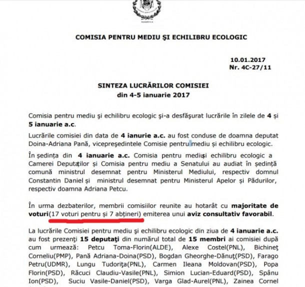 http://www.cdep.ro/comisii/mediu/pdf/2017/sz010405.pdf – raportul comisiei în care se consemnează rezultatul votului