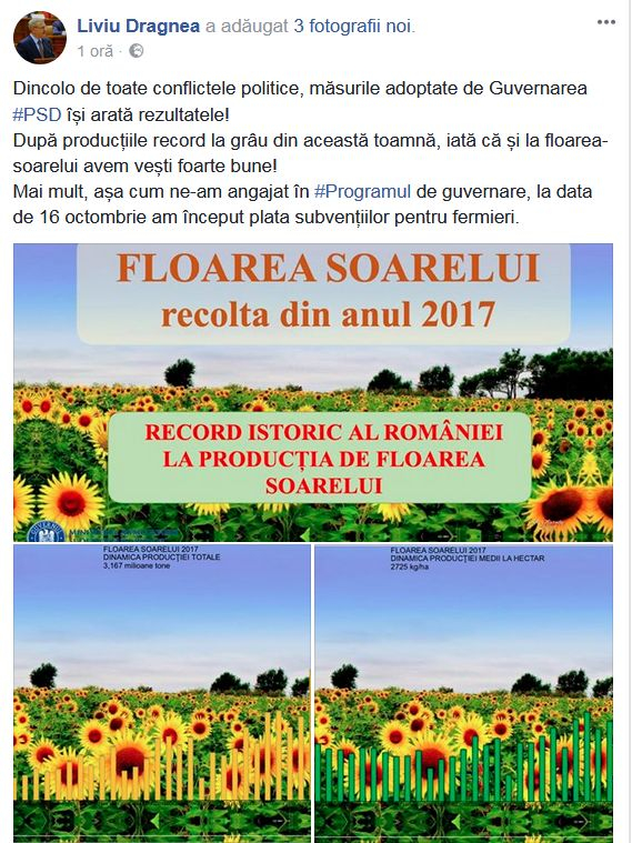 "Dincolo de toate conflictele politice, măsurile adoptate de Guvernarea #PSD își arată rezultatele! După producțiile record la grâu din această toamnă, iată că și la floarea-soarelui avem vești foarte bune! Mai mult, așa cum ne-am angajat în #Programul de guvernare, la data de 16 octombrie am început plata subvențiilor pentru fermieri."