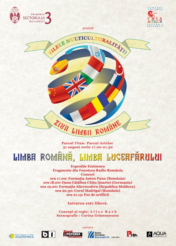 Primăria Sectorului 3 şi Centrul Cultural Casa Artelor anunţă un nou eveniment cultural. Sâmbătă, 31 august, ora 17:00, regizorul Alice Barb, directorul Centrului Cultural Casa Artelor îşi aşteaptă publicul la a treia întâlnire din cadrul programului cultural „Zilele Multiculturalităţii”, dedicat aniversării Zilei Limbii Române.
