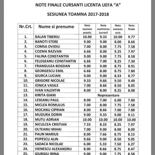 Notele finale de la examen au fost postate chiar de către Adrian Mutu pe pagina personală de Facebook, iar pe lista de admiși se mai observă și numele unor foști fotbaliști, precum Tiberiu Bălan (ex. Sportul, Rapid, Steaua) sau Nicolae Grigore (ex. Rapid).