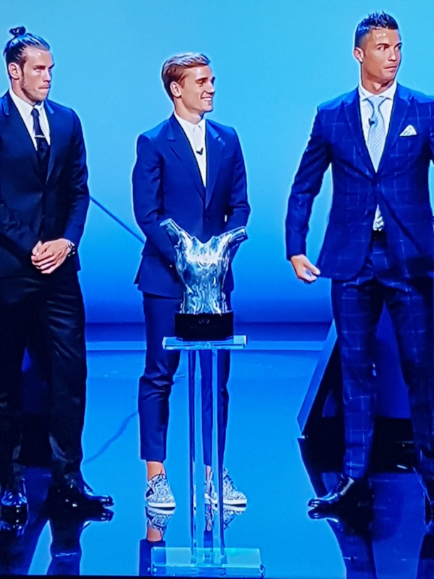 Ronaldo și Bale au optat pentru ținute elegante, dar Griezmann a dorit să iasă puțin din tipare. A accesorizat ținuta cu o pereche de încălțări sport argintii și sclipitoare, stârnind un val de glume pe internet.