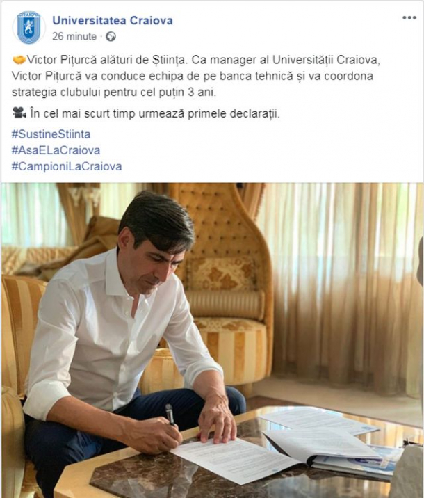 Victor Piţurcă a fost numit, joi, în funcţia de manager al echipei de fotbal Universitatea Craiova, a anunţat clubul pe pagina sa de Facebook.