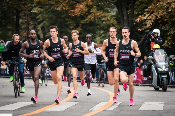 Foto: Eliud Kipchoge (în alb) și „pacemakerii” (iepurii) lui (sursă foto: Facebook / Eliud Kipchoge)