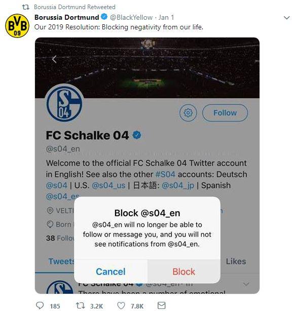 Inițiativă inedită pentru Borussia Dortmund, liderul din Bundesliga, care dorește să înceapă anul fără nicio urmă de negativism. Astfel, relatează gsp.ro, administratorul paginii de Twitter a Borussiei i-a dat block paginii lui Schalke, rivala tradițională din fotbalul german.