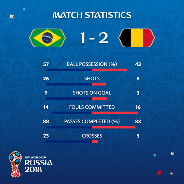 Pentru Belgia au marcat Fernandinho în minutul 13 (autogol) şi De Bruyne în minutul 31. Golul Braziliei a fost înscris de Renato Augusto, în minutul 76.