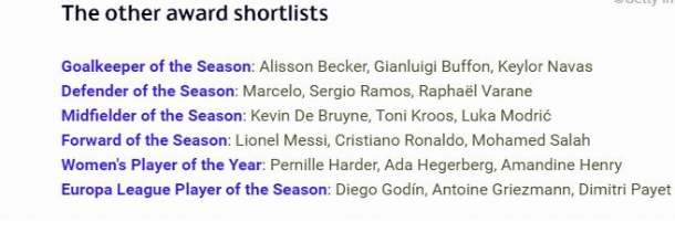 Luka Modric, Cristiano Ronaldo şi Mohamed Salah sunt cei trei fotbalişti anunţaţi de UEFA drept finalişti. Câștigătorul va fi desemnat pe 30 august, la Monaco, în aceeași zi în care va fi stabilită componența grupelor Ligii Campionilor.