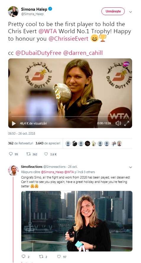 Mai mult, ea a primit trofeul Chris Evert pentru că va încheia anul pe primul loc în clasamentul mondial, indiferent ce se va întâmpla la Singapore.