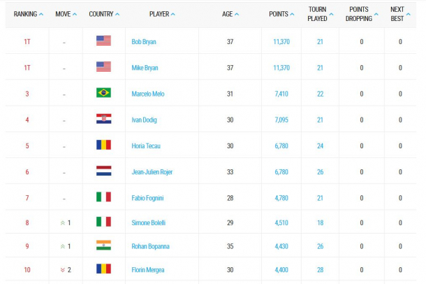 În schimb, Florin Mergea a coborât două poziţii şi se află pe locul 10, cu 4.400 de puncte.