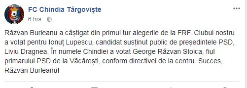 „Răzvan Burleanu a câștigat din primul tur alegerile de la FRF. Clubul nostru a votat pentru Ionuț Lupescu, candidat susținut public de președintele PSD, Liviu Dragnea. În numele Chindiei a votat George Răzvan Stoica, fiul primarului PSD de la Văcărești, conform directivei de la centru. Succes, Răzvan Burleanu!”, a scris Chindia Târgovişte pe Facebook.