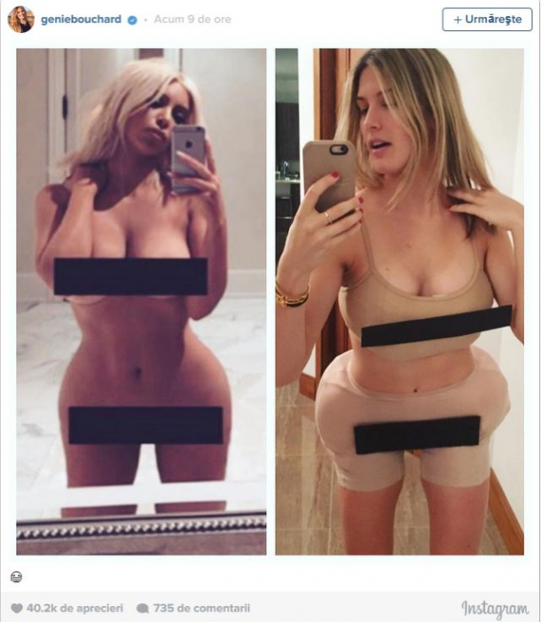 Sportiva, care are mai mult de 1 milioane de urmăritori pe Instagram, și-a introdus hârtii în lenjeria intimă și s-a pozat în aceeași postură ca modelul american, postând poza pe contul propriu cu referire la "Kim K".