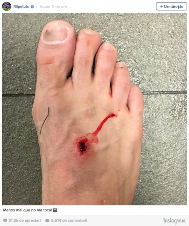 La finalul meciului, Filipe Luis a postat pe Instagram o poză cu urmele lăsate pe picior de crampoanele adversarului.