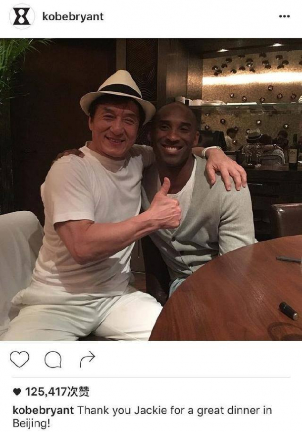 O onoarea mai mare i-a făcut-o actorul Jackie Chan care l-a invitat să ia cina împreună. Kobe Bryant a postat pe rețele de socializare o poză cu acesta.