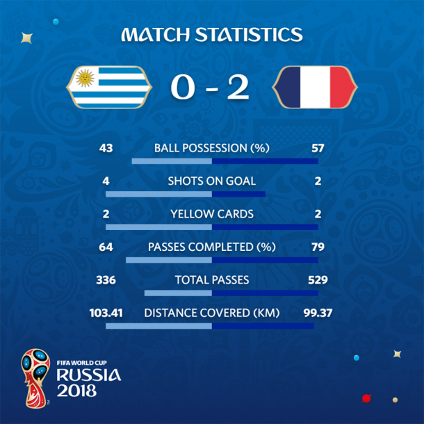 Varane a deschis scorul în minutul 40, cu o lovitură de cap bine plasată. S-a făcut 2-0 în minutul 61, când Griezmann a trimis un șut de la mare distanță, slab, însă Muslera a scăpat mingea în poartă, relatează gsp.ro.