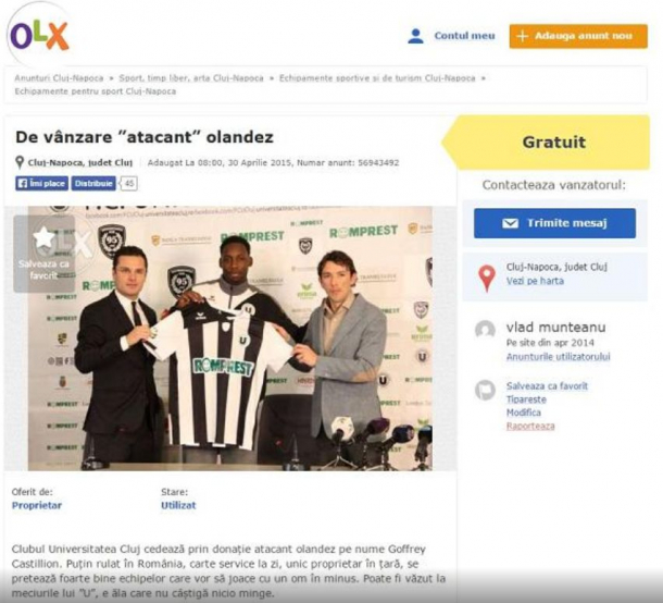 „Clubul Universitatea Cluj cedează prin donație atacant olandez pe nume Goffrey Castillion. Puțin rulat în România, carte service la zi, unic proprietar în țară, se pretează foarte bine echipelor care vor să joace cu un om în minus. Poate fi văzut la meciurile lui ”U”, e ăla care nu cîștigă nici o minge”, a fost descriere anunțului.