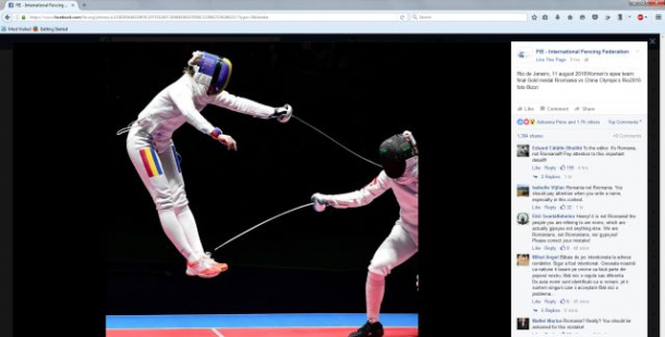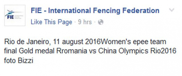 Și greșeala pare să nu fi fost una de moment, deoarece în majoritatea celor 114 poze postate în legătură cu meciul fetelor de la scrimă au la descriere: "Rio de Janeiro, 11 august 2016Women's epee team final Gold medal Rromania vs China Olympics Rio2016 foto Bizzi".