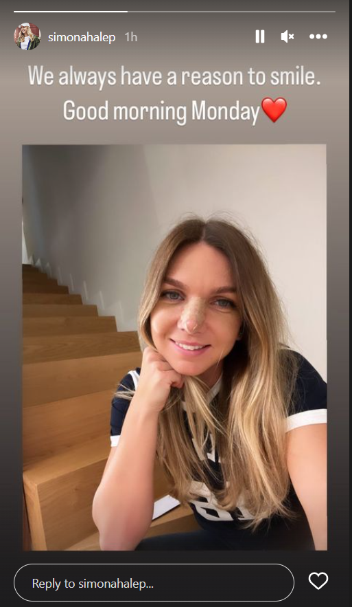 „Mereu avem un motiv să zâmbim. Bună dimineața, zi de luni”, a scris Halep, luni dimineața, pe Instagram.