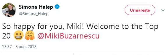 „Sunt atât de bucuroasă pentru tine, Miki! Bine ai venit în Top 20!”, a fost mesajul postat pe Twitter de Simona Halep.