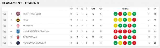 Echipa antrenată de Edward Iordănescu este liderul campionatului. În etapa a 8-a, campioana a câștigat pe terenul Universității Craiova (3-1), iar FCSB a terminat la egalitate la Sf. Gheorghe (2-2), astfel că formația clujeană are un avans de trei puncte.