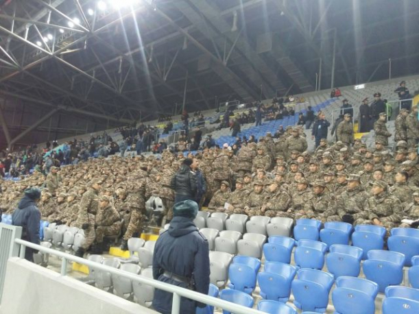 Meciul disputat marți la Astana a avut parte și de un moment comic, după ce oficialii kazaci au decis să umple un sector al stadionului numai cu militari aduși pentru a viziona partida.