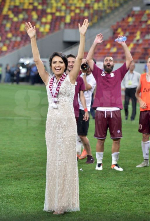 Moment inedit la finalul meciului dintre CSA Steaua şi Academia Rapid din play-off-ul Ligii a 4a. O mireasă a intrat pe gazon cu un fular vişiniu la gât.