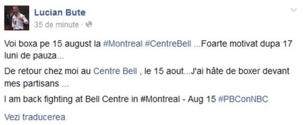 „Voi boxa pe 15 august la #Montreal #CentreBell … Foarte motivat după 17 luni de pauză…”, este mesajul postat de Bute.