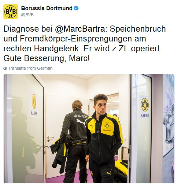 Clubul a anunțat pe Twitter însă că Bartra a fost în cele din urmă operat la încheietura mâinii drepte.