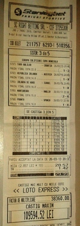 Meciuri cu noroc pentru un român: A câștigat la pariuri cu un bilet cu cotă 4312! (FOTO)