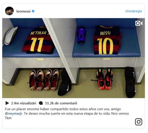 "A fost o plăcere enormă să împart toți acești ani cu prietenul meu Neymar. Îți doresc mult noroc în noul episod din viața ta. Ne vedem în curand" a scris emoționant, Messi, postând și o imagine cu echipamentul lor din vestiar.