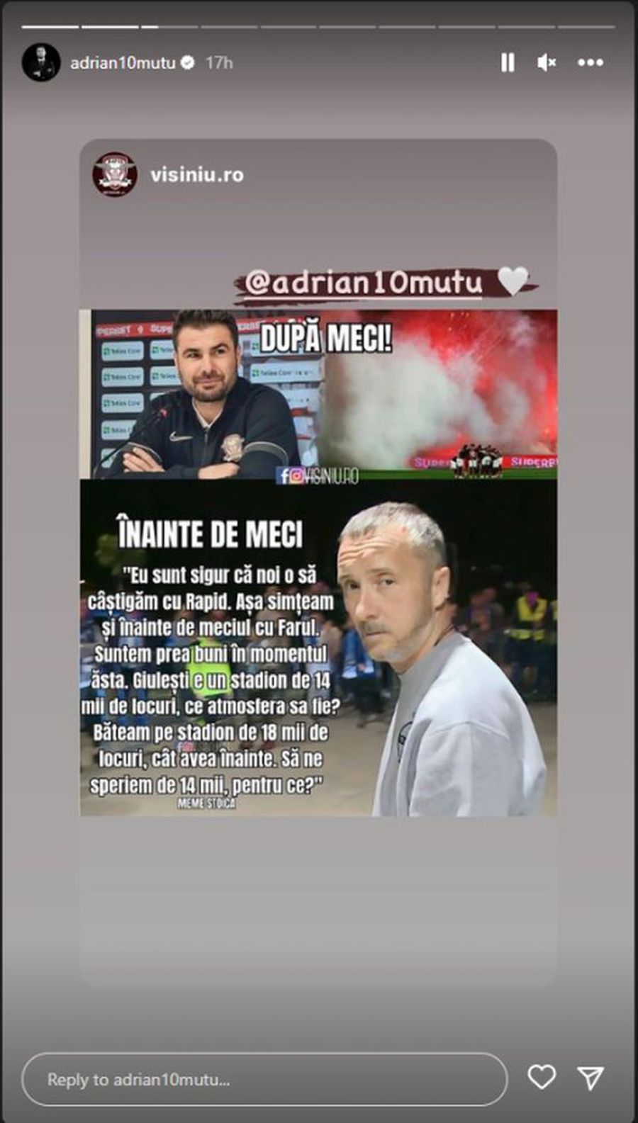 Adrian Mutu a repostat, la InstaStory, o poză de pe contul„vișiniu.ro”, în care apare MM și declarația lui dinaintea meciului alături de o imagine cu Mutu la finalul partidei, zâmbind.