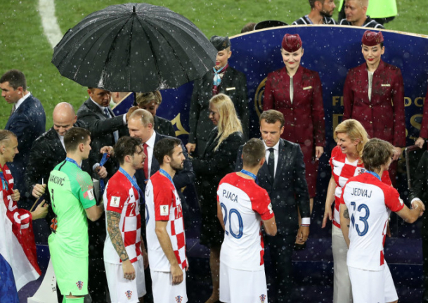 Imaginile de la ceremonia de premiere în care Vladimir Putin este păzit cu umbrela în timp ce preşedintelui francez Emmanuel Macron şi celcroat Kolinda Grabar-Kitarovic stau în ploaie torenţială au fost amplu dezbătute în mediul online.