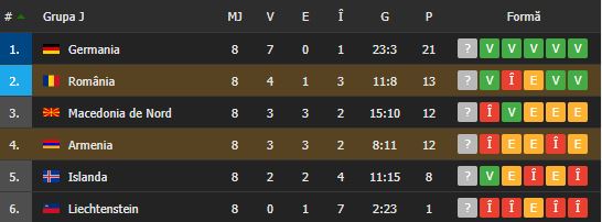 Cu două etape înainte de finalul campaniei de calificare, Germania este lider, cu 21 de puncte din 24 posibile, urmată de România, cu 13 și Macedonia de Nord, respectiv Armenia, cu câte 12 puncte. Islanda este pe 5, cu 8 puncte.