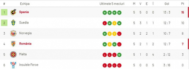Spania este lider în clasament, cu 15 puncte din tot atâtea posibile, iar tricolorii au coborât de pe trei pe patru, ei având şapte puncte.