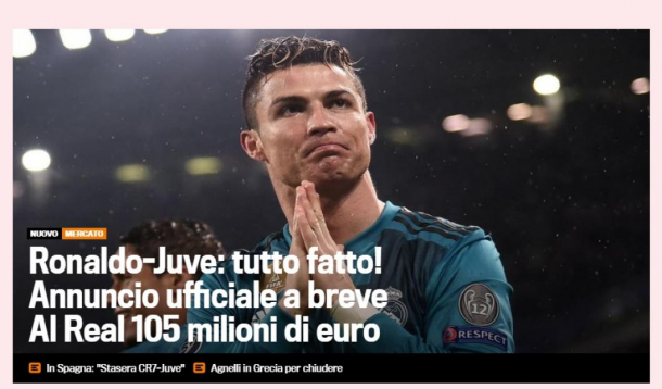 „Real și Juventus s-au înțeles, lipsește doar anunțul oficial” anunță Marca, în timp ce AS scrie că „Real Madrid și-a dat acordul pentru vânzarea lui Cristiano Ronaldo”. Lusitanul va părăsi Madridul după 9 ani și 450 de goluri. Mundo Deportivo merge și mai departe și anunță că „Transferul lui Cristiano Ronaldo la Juventus poate fi oficializat în această după-amiază”, în timp ce Sport notează că „Totul e doar o chestiune de ore. Madridul va anunța azi transferul lui Cristiano la Juventus”. Informația este confirmată și de italienii de la Gazetta dello Sport.