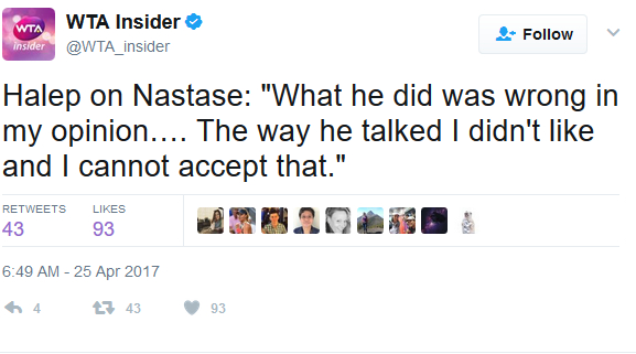"Ceea ce a făcut a fost greșit din punctul meu de vedere. Nu mi-a plăcut deloc felul în care a vorbit și nu pot să accept așa ceva", a spus Simona Halep, potrivit Hotnews.