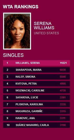 Pe primul loc în clasamentul WTA se menține Serena Williams (SUA), cu 11.821 de puncte, fiind urmată de Maria Şarapova (Rusia), cu 6.036 de puncte.