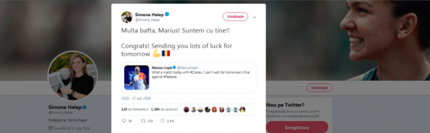 „Multă bafta, Marius! Suntem cu tine!!”, a scris Simona Halep pe pagina sa de Twitter, felicitându-l pe Copil pentru parcursul reuşit la turneul din oraşul natal al marelui campion elveţian.