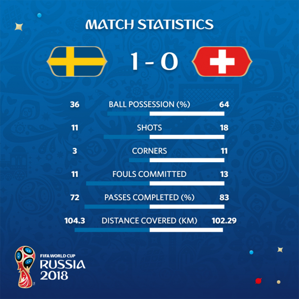Unicul gol al meciului a fost marcat de Forsberg, în minutul 66, cu un şut din afara careului, mingea fiind deviată de Akanji în poarta lui Sommer.