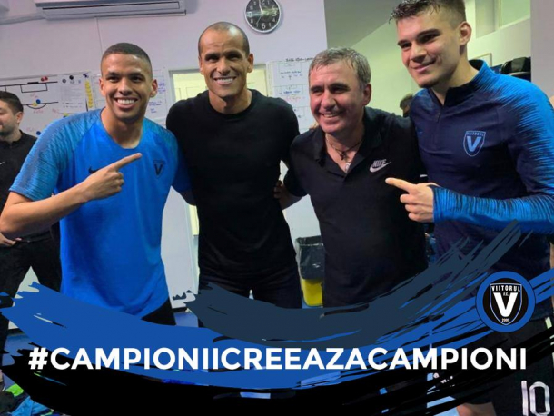 Rivaldinho, Rivaldo, Gică Hagi și Ianis Hagi apar cu toții într-o poză, alături de mesajul ”Campionii creează campioni”.