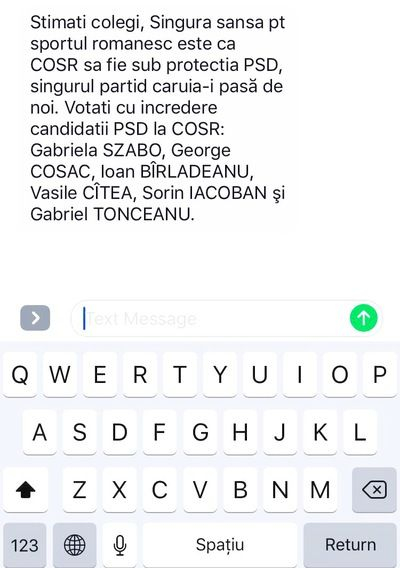 "Stimați colegi, Singura șansă pt sportul românesc este ca COSR să fie sub protecția PSD, singurul partid căruia-i pasă de noi. Votaţi cu încredere candidații PSD la COSR: Gabriela SZABO, George COSAC, Ioan Bîrlădeanu, Vasile CÎTEA, Sorin IACOBAN și Gabriel TONCEANU”, este SMS-ul trimis înainte de alegerile de la COSR, potrivit sursei citate.