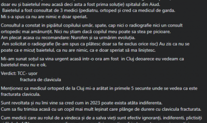 Mi-am sunat soțul să vină urgent acasă, într-o oră am fost în Cluj deoarece eu vedeam că băiețelul meu nu e ok. Verdict: TCC – ușor, fractură de claviculă. Menționez că medicul ortoped de la Cluj mi-a arătat în primele 5 secunde unde se vedea că este fracturată clavicula. Sunt revoltată și nu îmi vine să cred cum în 2023 poate exista atâta indiferență. Cum să fiu trimisă acasă cu un copil mai mult leșinat care plânge de durere cu clavicula fracturată.