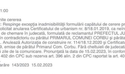 Miercuri, 15 februarie, instanța a decis anularea Autorizaţiei de construire nr. 114/18.12.2020 şi a Certificatului de urbanism nr. 8/18.01.2019, emise de primarul Comunei Corbu; decizia nu este definitivă, dezvoltatorii reclamați putând face recurs în termen de 15 zile de la comunicare – relatează publicația locală Dobrogea Live.
