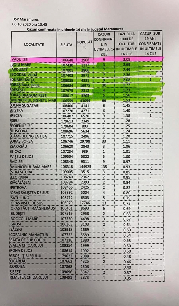 În funcție de evoluția situației epidemiologice la nivelul județului, Comitetul Județean pentru Situații de Urgență poate stabili și alte măsuri care să prevină și să limiteze infecția cu noul Coronavirus la nivelul comunităților locale. Având în vederea creșterea numărului de cazuri în județ, reiterăm cetățenilor solicitarea de a respecta măsurile stabilite de către autorități în perioada stării de alertă, normele de protecție individuală, păstrarea distanței fizice de protecție sanitară, igienizarea frecventă a mâinilor și evitarea pe cât posibil a zonelor aglomerate, a mai adăugat prefectul de Maramureș”se arată în comunicatul autorităților locale din Maramureș.